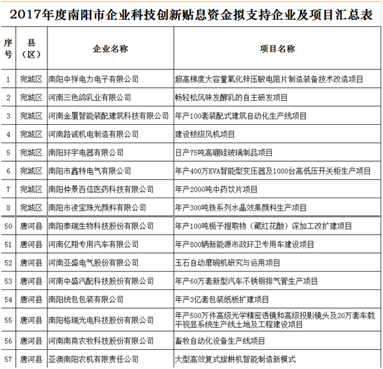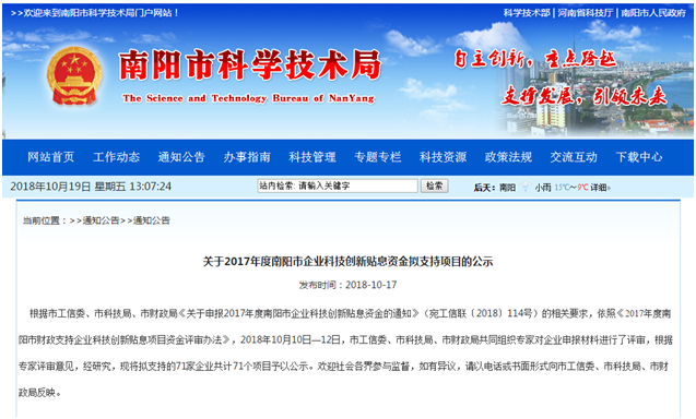 根據市工信委、市科技局、市財政局《關于申報2017年度南陽市企業(yè)科技創(chuàng)新貼息資金的通知》(宛工信聯(lián)〔2018〕114號)的相關要求,依照《2017年度南陽市財政支持企業(yè)科技創(chuàng)新貼息項目資金評審辦法》,2018年10月10日—12日,市工信委、市科技局、市財政局共同組織專家對企業(yè)申報材料進行了評審,根據專家評審意見,經研究,現將擬支持的71家企業(yè)共計71個項目予以公示。歡迎社會各界參與監(jiān)督,如有異議,請以電話或書面形式向市工信委、市科技局、市財政局反映。